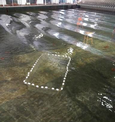 该项目测试的大型围网设施采用浮绳式结构,周长达300米、养殖水体达10万方,可安置于水深20米以上的海域,未来将在山东莱州和大连长海等相关海域投入使用。通过系统的物理模型试验,攻克了小尺度网衣的精准模拟、超柔性结构的锚碇系统设计、网衣运动变形非接触式测量等多项技术难题,同时重点解决了浪、流等环境荷载作用下网衣受力分布与荷载传递、浮筒运动响应、网衣运动变形、贴底系统稳定性等关键科学问题。研究成果可为浮绳式围网的浮筒、纲绳、锚绳、贴底系统等细部结构的选型设计提供参考依据,对于确定围网的抗风浪、耐流性能具有重要指导意义。
