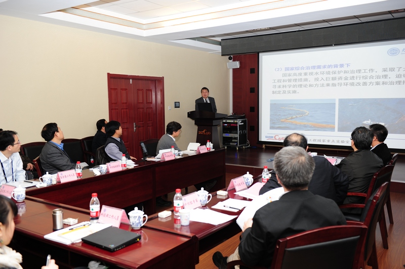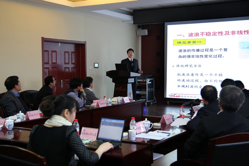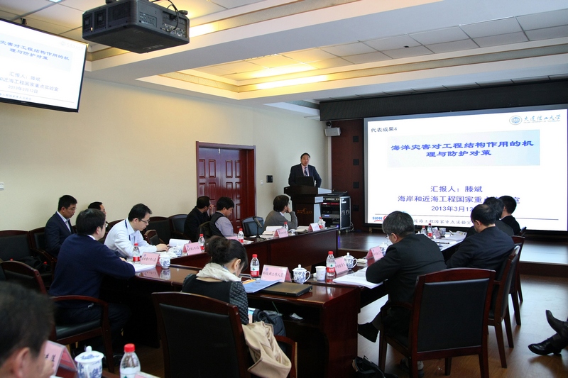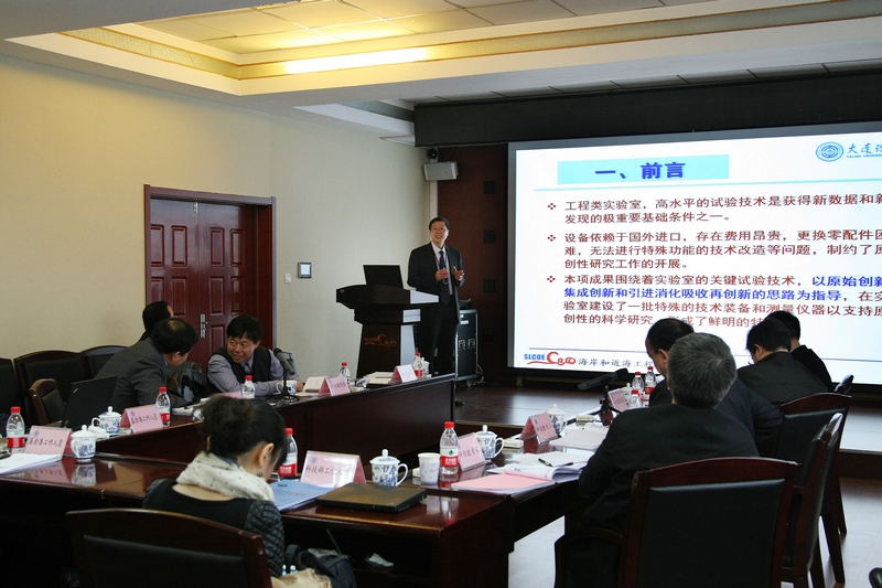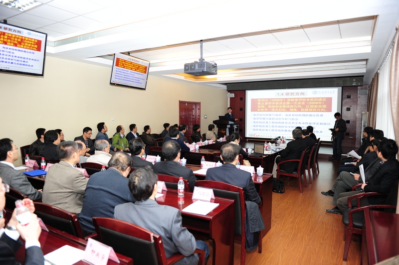 海岸和近海工程国家重点实验室主任董国海教授首先作了实验室工作汇报,从实验室的沿革发展、研究水平与学术贡献、队伍建设与人才培养、开放交流与运行管理、不足之处与未来展望五个方面全面介绍了实验室工作,并接受了专家组提问。专家组还听取了实验室五个代表性学术报告,分别是:柳淑学教授的《非线性波浪特性及其模拟研究》、沈永明教授的《近海环境中物质输运动力及污染机理研究》、欧进萍院士的《海洋工程结构体系与全寿命安全评定》、滕斌教授的《海洋灾害对工程结构作用机理与防护对策》、王永学教授的《海岸和近海工程现场观测与实验室物理模拟新技术》。