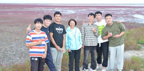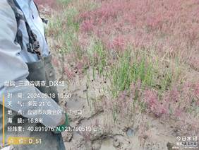 此次现场调查的过程,梁书秀教授欣喜地发现门口岗的盐沼湿地上已经广泛出现了海三棱藨草的定植,翅碱蓬、芦苇和海三棱藨草交织成红绿相间、层次分明的盐沼植被景观,这是课题组首次在门口岗的盐沼湿地上发现海三棱藨草以来面积最大的一次,表明近几年随着辽河入海径流的增加,入海河口的典型盐沼植被多样性增加。本次调查为进一步深入研究辽河口生境和盐沼湿地植被的演变提供了良好的数据支持。