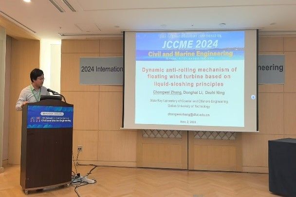 2024年11月1日至4日,2024年土木与海洋工程国际会议(JCCME 2024)在韩国济州成功举办,我室宁德志教授担任大会主席并致开幕辞。会上,滕斌教授作主旨报告“Simulation of a moored ship in front of different kind of docks”,介绍我室在船舶靠岸系泊领域的仿真技术新进展;陈丽芬教授作主旨报告“Nonlinear resonances of surface waves over an array of ocean structures”,介绍我室在海洋结构阵列非线性波浪共振方向的研究成果;张崇伟副教授作邀请报告“Dynamic anti-rolling mechanism of floating wind turbine based on liquid-sloshing principles”,介绍我室在浮式风机动态减摇方面的相关研究工作;另有我室4名研究生作口头报告,其中李东海同学获“优秀报告奖”。