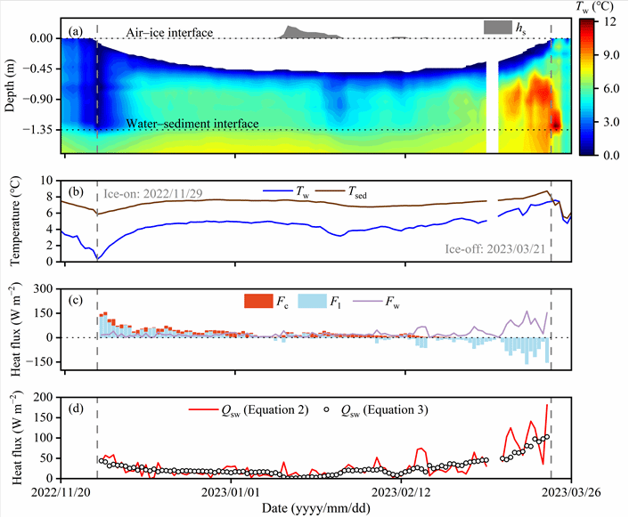 图1. 乌梁素海冰封期:(a) 雪深和冰下温度,(b) 平均水温(Tw)和沉积物温度(Tsed),(c) 冰底传导热通量(Fc)、潜热通量(Fl)和水-冰热通量(Fw),(d) 水体吸收的太阳辐射(Qsw)。