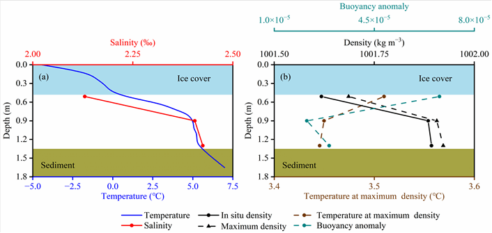 图2. 乌梁素海冰-水竖向剖面:(a) 温度和盐度,(b) 密度、最大密度和密度异常。