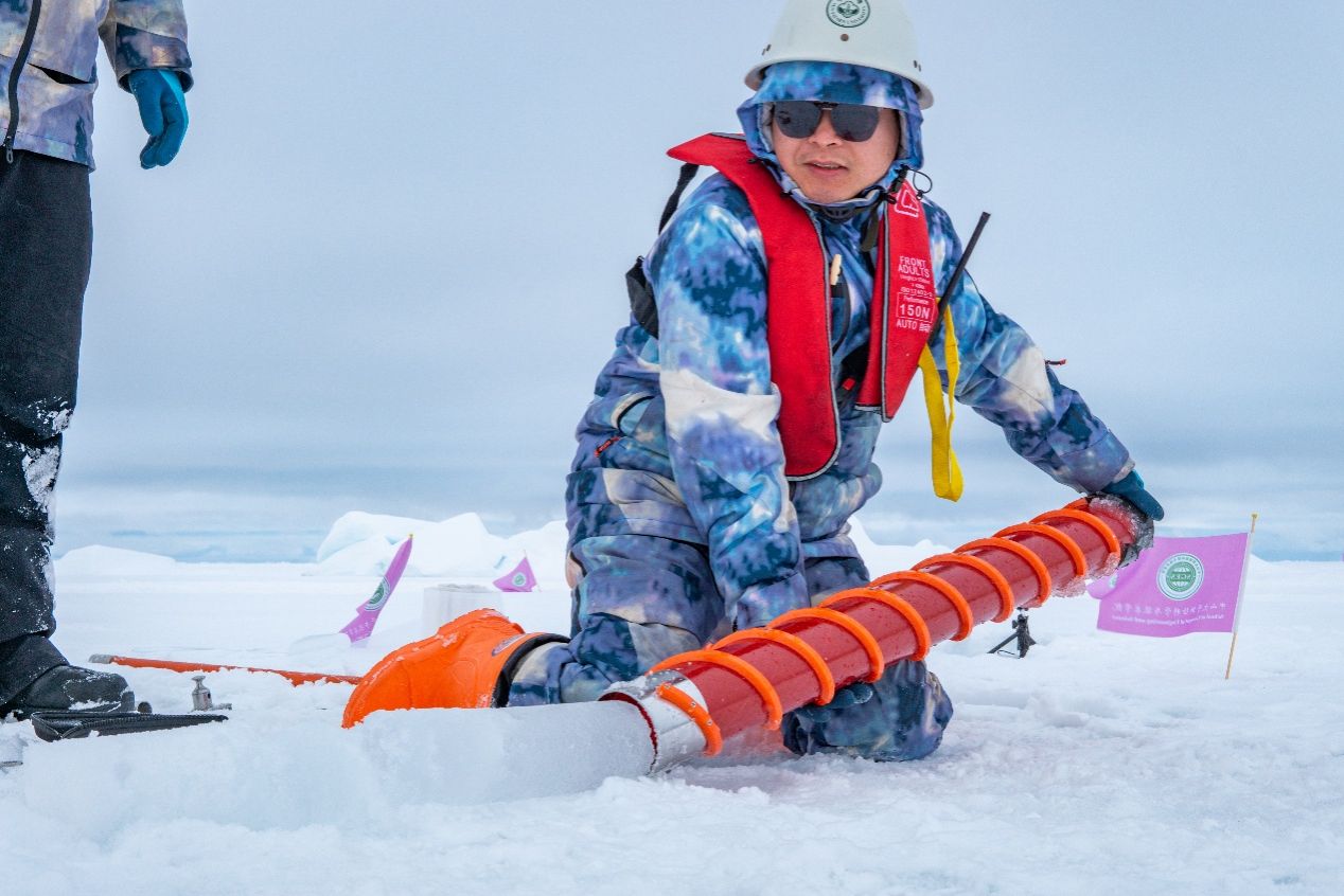卢鹏教授在本次考察中主要负责海冰基本物理和力学性质、冰雪辐射特征等现场考察任务。在现场考察过程中,卢鹏教授克服北极恶劣的天气条件,与其他考察队员密切合作,圆满完成了各项工作,获得了大量珍贵的第一手北极海冰现场观测数据。作为冰站队队长,卢鹏教授积极协调现场作业人员、时间与任务,保证了各项海冰现场调查任务的顺利完成,被评选为本航次“先进个人”。同时,在航次中首次面向在校学生开设的冰上、船上联动直播课程,卢鹏教授结合科考任务为同学们讲解了冰站冰芯采样与观测过程。