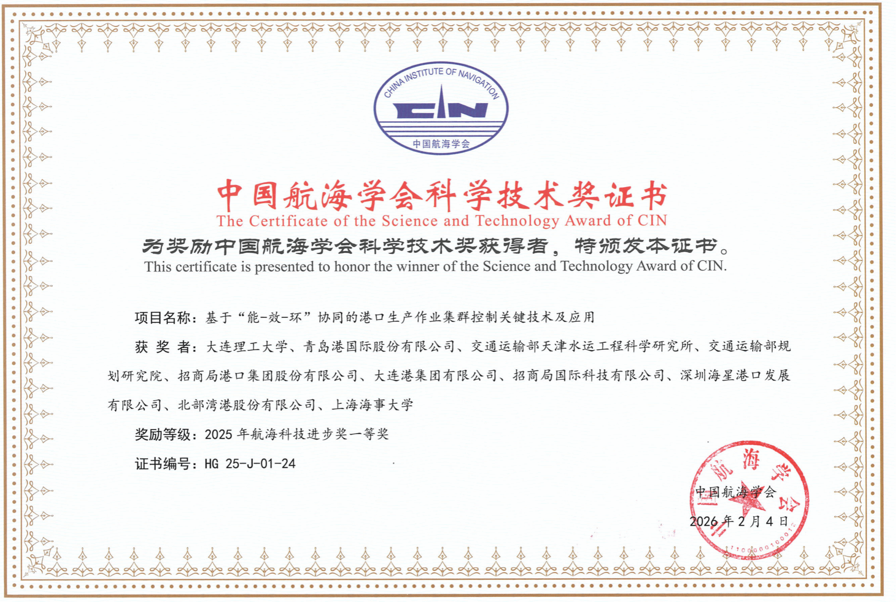 实验室牵头完成的2项一等奖成果分别聚焦海洋工程结构安全与港口智慧绿色转型两大方向。其中,勾莹副教授牵头完成的“非线性波浪与海洋工程结构作用的分析方法及耦合作用特性研究”揭示了多体结构复杂共振及大型弹性结构非线性响应机理,为海洋工程装备自主创新与安全保障提供了支撑。王文渊教授牵头完成的“基于‘能—效—环’协同的港口生产作业集群控制关键技术及应用”构建了港口生产作业集群控制全链条技术体系,为港口作业系统绿色化、智能化发展提供了关键技术支撑。