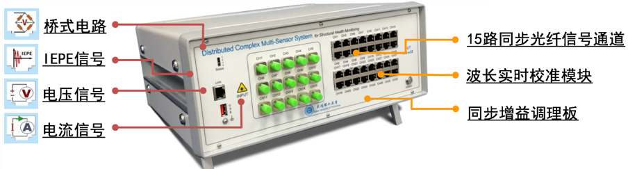 针对恶劣海洋环境导致传感器存活率低、长期稳定性差、测量精度低的问题,李宏男教授团队提出了一种基于等效长度比原理的光纤光栅应变传感器封装方法。该方法消除了胶粘剂对光纤光栅应变传递的影响,避免了栅区粘接不均匀带来的反射波长啁啾现象,通过调整封装构件的尺寸实现了传感器的增敏设计,极大地提升了光纤光栅传感器在海洋结构健康监测中的长期稳定性和耐久性。该项成果在2017年获评“中国专利优秀奖”。 针对海洋工程结构传感器类型多、同步精度高、长期稳定性好、数据分析实时性强的需求,李宏男教授团队自主研发了国际首创的分布式多类型传感器同步采集装备,仅用一台设备实现了对“光纤、电压、电流、IEPE和桥式电路”五类常用监测信号的采集。该设备已通过东北国家计量测试中心(国家四大计量测试中心之一)的检测(证书编号:辽计14070321714号);并以本设备为核心技术,申请获得了2015年度国家技术发明二等奖和2017年中国国际工业博览会创新银奖。