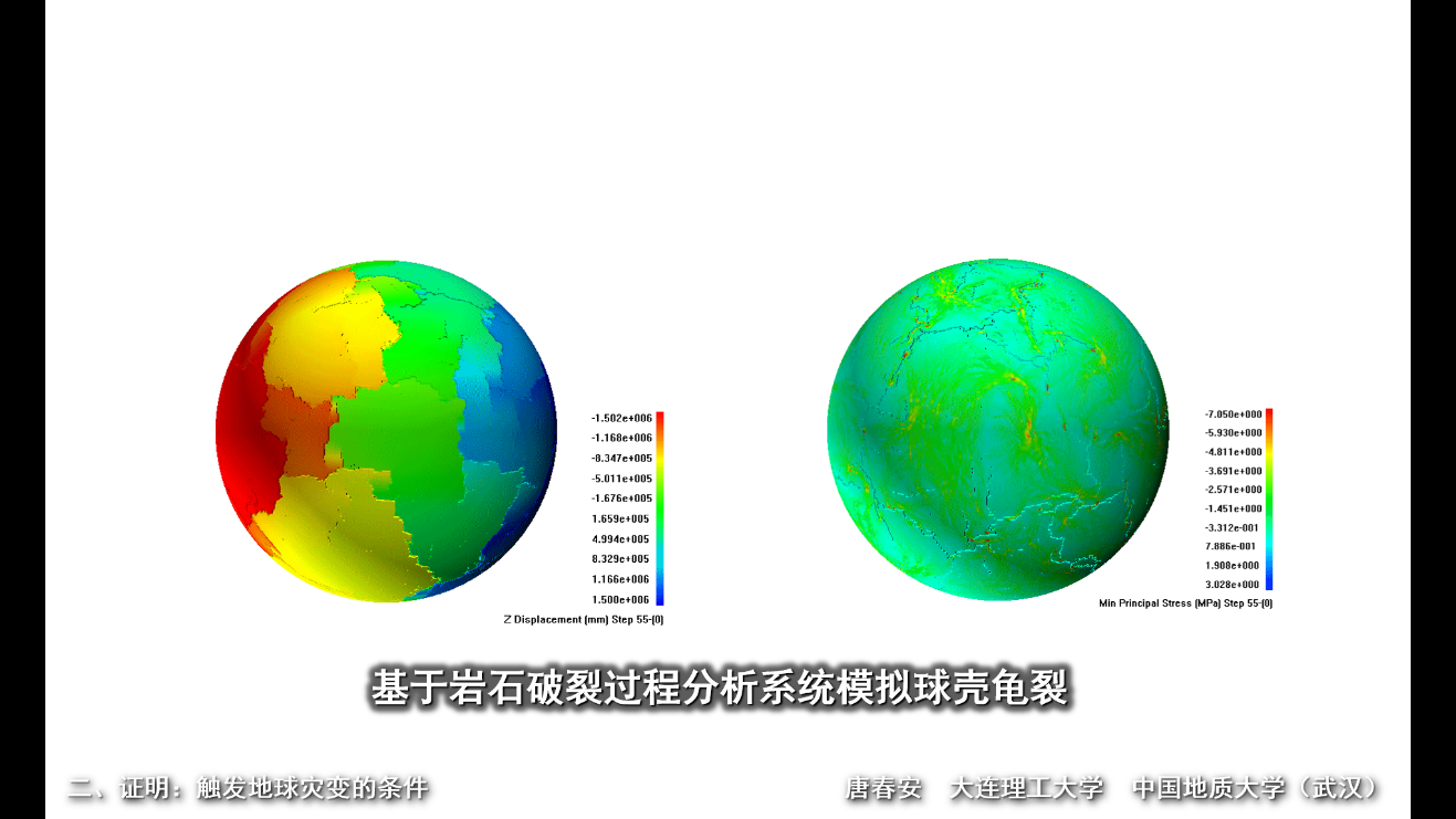 唐春安教授长期从事岩石破裂过程机理和数值模拟方法研究。近年来,他基于多年的岩石破坏力学研究基础,积极开展跨界地球科学的交叉学科研究,提出了以地球自身热平衡为驱动力的地球演化新假说——地球大龟裂。通过建立地球系统的热平衡方程,阐述了热平衡性态变化导致地球周期性冷、热变化的基本规律,对地球演化过程中的板块起源、超大陆裂解、漂移和碰撞、火山形成、生物灭绝触发机制、冰河生长与消融以及全球变暖等一系列彼此相关的重大地质事件给出了新的解释,得到地质学科主流的关注。已先后在《Physical Review E》、《American Journal of Science》、《Geological Journal》、《Science Bulletin》和《Nature Communications》等发表数篇地球演化相关论文,连续六年入选爱思唯尔《地球和行星科学》领域中国高被引学者榜单,并被中国地质大学(武汉)外聘为大地构造学科首席教授。