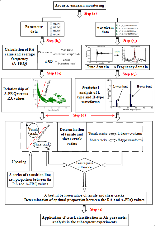 在该论文中,张博士提出一种根据声发射(AE)参数来确定岩石类材料分类的方法。在微观尺度上,岩石类脆性材料的破坏是由裂纹萌生、扩展和聚结引起的。声发射技术被广泛用于研究脆性材料的裂纹扩展过程。声发射技术分为波形分析和参数分析两种方法,参数分析方法因其便捷高效的优势得到了更加广泛地应用。然而,现有参数分析方法的裂纹分类标准基于RA和A-FRQ值之间关系的经验判断,尚无确定方法。针对这一研究空白,该研究提出了一种基于主频特征统计分析的方法,用于确定声发射参数分析中的裂纹分类标准。该方法结合波形分析和参数分析的优点,极大提高了声发射裂纹分类以及结构监测和损伤分析的准确性和效率。研究发现,硬岩的RA和A-FRQ值的最佳比率大约为1:100至1:500,研究结果对于提升认识岩爆、滑坡等工程灾害中岩石受力特点与破裂类型具有重要意义。