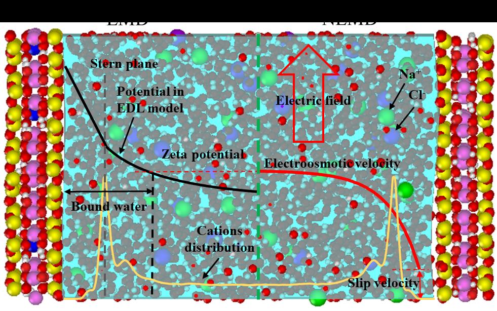 针对上述问题,裴华富教授团队从结合水形成机理出发,基于双电子层理论,系统地提出了黏土强结合水边界位于流动电位的剪切面位置,而弱结合水边界位于扩散层的古伊面位置。团队进一步应用平衡态和非平衡态分子动力学技术,模拟了蒙脱土在电场作用下孔隙水的定向流动现象,确定了蒙脱土的双电子层结构,准确测定了蒙脱土的结合水膜厚度,与实验测定结果对比,验证了提出的新方法的有效性。在此基础上,团队研究了蒙脱土结合水的微观物理性质,结果表明,结合水受到黏土表面施加的大于103kPa的压应力,其剪切粘度几倍于自由水。该成果为不仅系统地阐述了结合水形成机理,也为测定结合水膜厚度提供了新思路。
