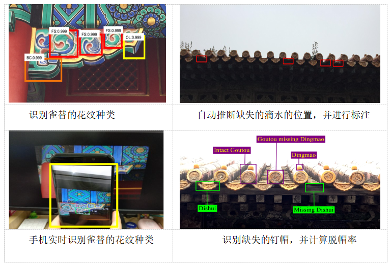 为提高古建筑表观病害检测效率,研究团队提出了基于卷积神经网络的砖砌体裂缝、剥落、泛碱等病害的自动识别模型。使用图像分割算法Mask R-CNN对故宫屋顶的瓦片的脱釉情况进行量化。通过计算脱釉部分的像素面积和总体面积的比值,获得瓦片脱釉率。相关成果发表在Computer-Aided Civil and Infrastructure Engineering期刊。研发了针对故宫城墙表观病害特征的目标探测算法,构建了基于Faster R-CNN架构的城墙表面病害探测模型。使用目标检测算法Faster R-CNN检测故宫城墙砖块的3种缺陷:剥落、裂缝和泛碱。相关成果发表在Automation in Construction期刊。团队相关研究为我国文化遗产自动化管养和修复提供理论和技术支撑。