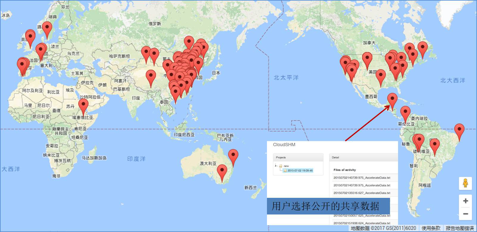 研究团队开发手机云监测共享平台收集监测数据,注册用户可以登陆个人账号建立相应的监测主项目与监测子项目,实现对个人监测信息的管理。所监测数据通过地理位置信息一起发布至网站地图中,实现数据共享,便于公众查看。