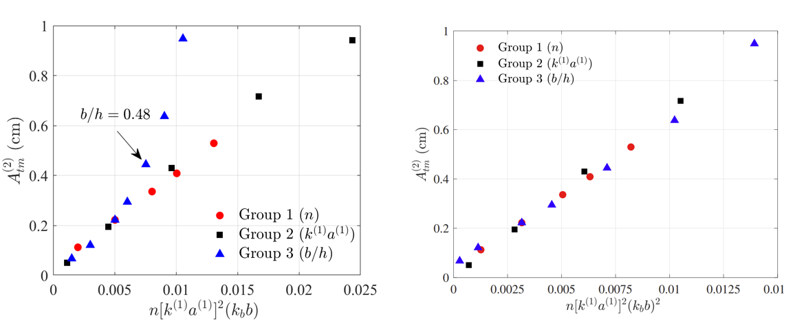 宁德志教授团队利用自主研发的基于高阶边界元方法的完全非线性数值波浪水槽对自由表面波和周期性结构的非线性相互作用开展了深入的研究。该工作首次证实了第四类次谐波布拉格共振(诱发共振反射波,且地形波和表面波非线性均同等重要)和二阶透射波诱发的第一类布拉格共振现象的存在。同时,该工作揭示了水下周期性结构主要结构参数与自由表面波非线性对第三类布拉格共振特性的影响规律,并首次提出当地形高度增大到一定阈值后,共振反射/透射波幅值与地形高度存在平方关系(而不是普遍认为的线性关系)。此外,文章还揭示了布拉格共振会诱发“拍”和“寄生拍”现象,从而可能使实际海域中产生局部较大的自由表面波运动。该研究对于进一步揭示近岸局部波浪场的特性,以及对“布拉格防波堤”的设计具有重要理论指导意义。