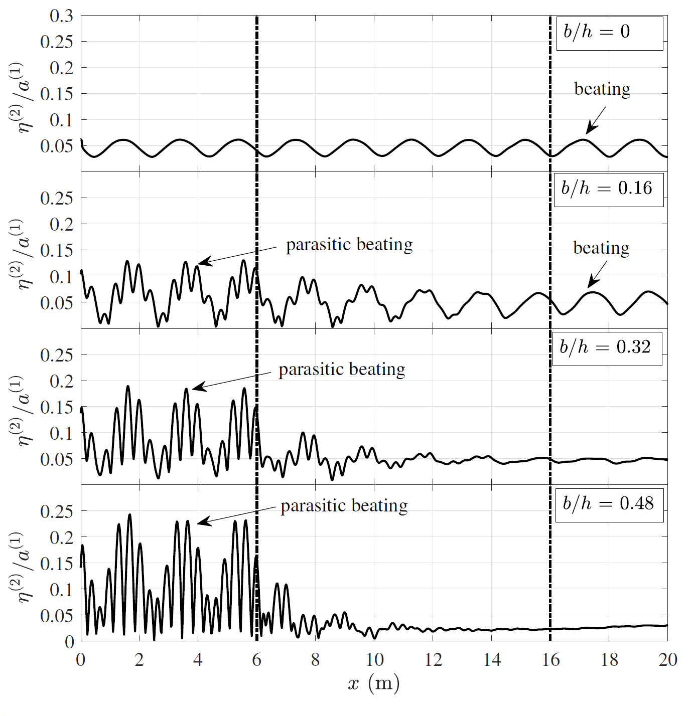 图3 第一类布拉格共振现象发生时,二阶自由波幅值沿水槽中线的空间分布;从上到下地形高度逐渐增大。点划线所指为周期地形存在位置。由于不同相位的二阶锁定波和自由波的叠加,在周期地形后诱发了波面的空间振荡现象“拍”。特别的是,由于第一类布拉格共振的发生,二阶反射锁定波/自由波在堤前的幅值增大,与二阶入射锁定/自由波的幅值相当。四个不同相位的二阶波浪在堤前叠加形成‘寄生拍’的特殊水动力现象,使得自由水面幅值大幅增大。