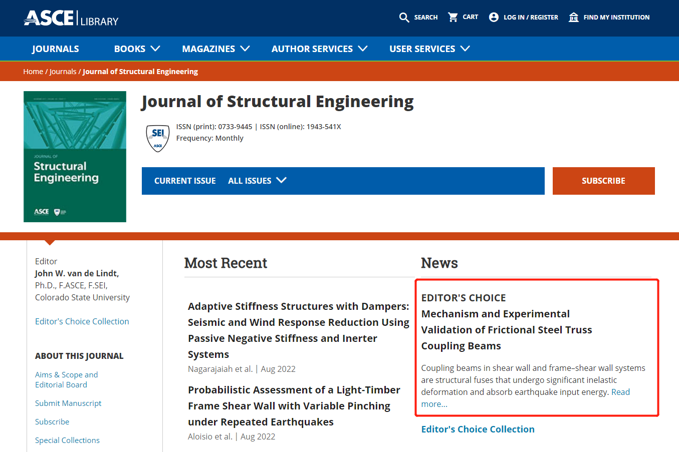 ASCE-JSE是国际公认的土木工程领域权威期刊,也是建工学部认证的国际顶级期刊、结构工程Top 1期刊,其2022年影响因子为3.858,是“工程-土木”和“工程-建造与建筑科技”领域JCR-2区期刊。Editor's Choice亮点文章是由期刊主编美国科罗拉多州立大学John W. van de Lindt教授在每期文章中选取一篇(1/35)具有重大科学意义的优秀论文予以推荐,在期刊官网和Twitter账号进行公告和宣传,并开放为期一个月的公众免费浏览。