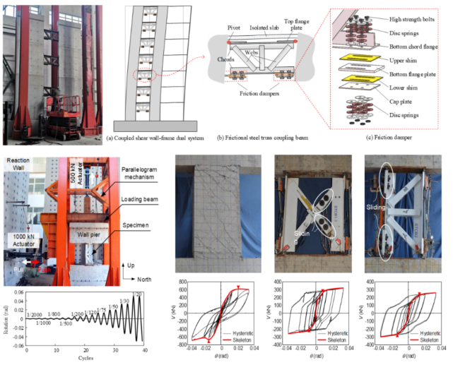 建设工程学部崔瑶副教授团队针对在传统钢筋混凝土剪力墙结构中,连梁在地震下塑性发展不明确、不易修复等性能缺陷,创新研发一种“摩擦钢桁架连梁”,在钢桁架连梁变形集中的部位设置可拆卸摩擦装置,连梁的变形能力由摩擦装置的滑移长度决定,通过调整连梁桁架和可拆卸摩擦装置的布置实现承载力和刚度解耦设计。建立了摩擦钢桁架连梁承载力、刚度和变形的理论计算公式,发展了适用于抗震分析和设计的理论滞回模型和宏观模型。摩擦钢桁架连梁传力路径清晰、受力明确、构造简洁,具有损伤可控、震后功能可恢复、强度-刚度结构、弯剪分离等优点,且滞回性能可准确预测与设计,为发展韧性结构构件和体系提供新的思路及设计理论依据,对提升我国工程结构防灾减灾能力有重要的科学意义和工程价值。