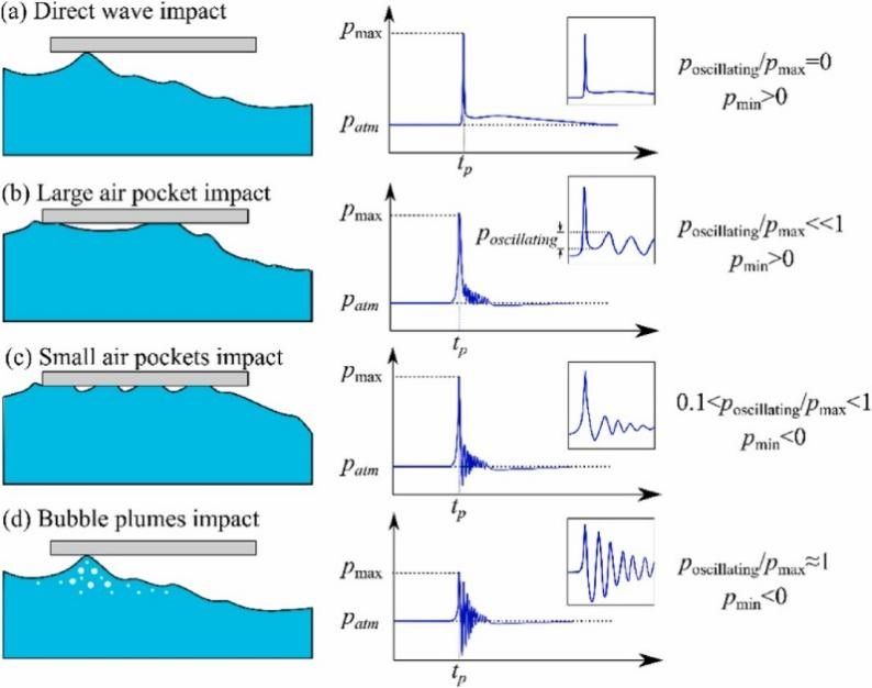 该研究创新性地将板式结构砰击类型分为纯水砰击、裹挟大/小气穴砰击和羽流砰击。该分类方法揭示了多尺度裹气砰击作用机理和控制内因,解决了裹气砰击“缓冲”或“放大”效应悖论的困扰,弥补了因砰击荷载随机性、多样性而导致的机理认识不足,在明确砰击荷载特性方面具有明显优势。