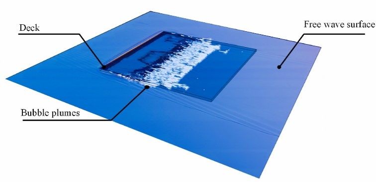 该研究聚焦于波浪砰击板式结构掺气流场中裹挟大气穴和微小气泡羽流的多尺度特性,在计算流体力学理论框架下对羽流特征物理量进行平均处理,构建了多尺度裹气砰击数值模型,能够准确模拟砰击过程中板下气穴/羽流的产生、随波流动、非均匀演化等过程,捕获的高充气率和紊乱的气泡羽流场与实验数据取得显著的一致性。
