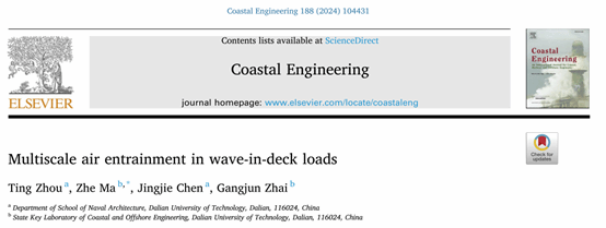 近日,实验室马哲副教授团队在海洋工程领域顶级期刊《海岸工程》(Coastal Engineering)发表题为“多尺度裹气效应下甲板上浪问题(Multiscale air entrainment in wave-in-deck loads)”的研究论文。