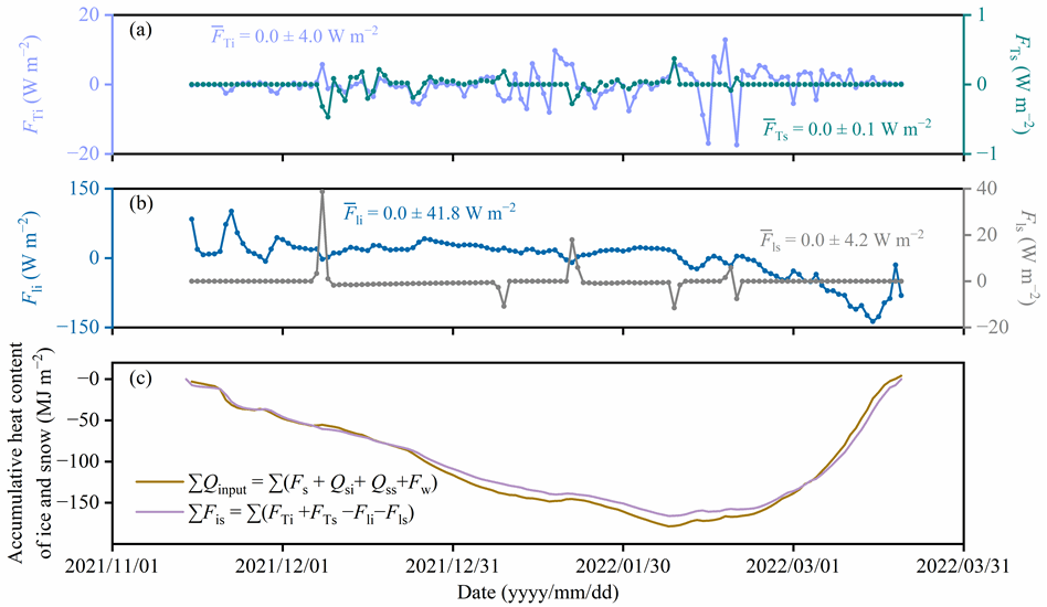 图2. (a) 冰(FTi)与雪(FTs)温度变化的显热通量,(b) 冰(Fli)与雪(Fls)厚度变化的潜热通量,(c) 冰雪累积热含量(∑Fis)与外部热量输入 (∑Qinput)随时间的闭合检验。